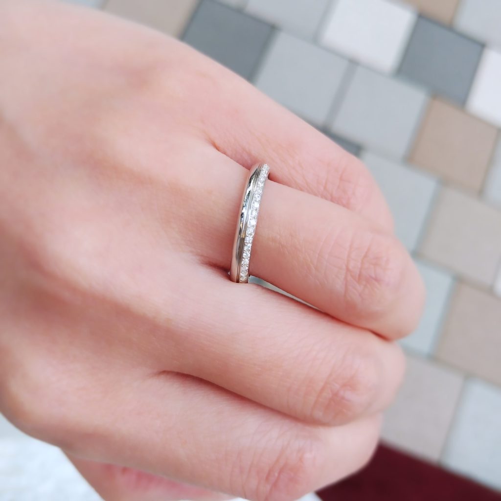 オンセンターのラインを境に、女性用リングへは半周にダイヤモンドを敷き詰めた、シンプルさと華やかさの両面を楽しめる結婚指輪(マリッジリング)。斜面にダイヤモンドを留めることで、周りの方から見られた時などもダイヤモンドの輝きがしっかり目に入る。男性用リングは、半周につや消し加工をするアレンジもおすすめ。煌めく多数のダイヤモンドは、まるでふたりの門出を祝福しているよう!