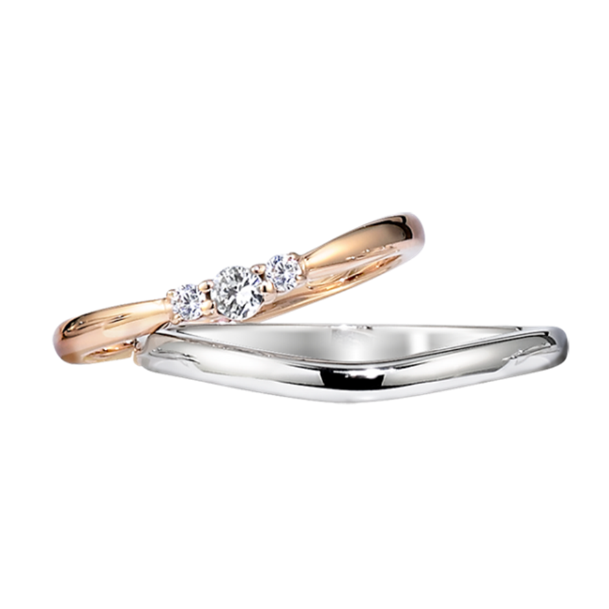 普段指輪を着け慣れない男性も抵抗なく着けられるシンプルなストレートタイプのリング。女性リングは5石メレダイヤモンドがあしらわれており、中央に向かってアームが絞られているのでダイヤが主張しすぎずにさり気なく着けられるが、その細身でシンプルなデザインが女性らしさやさり気ない華やかさを与えてくれる。男性リングは中央にくぼみがあり、そこが影となってプラチナの光沢感や上品さを引き立たせてくれる。どんな服装にも合わせやすく、おふたりのライフスタイルに自然と溶け込むさり気なさが魅力!