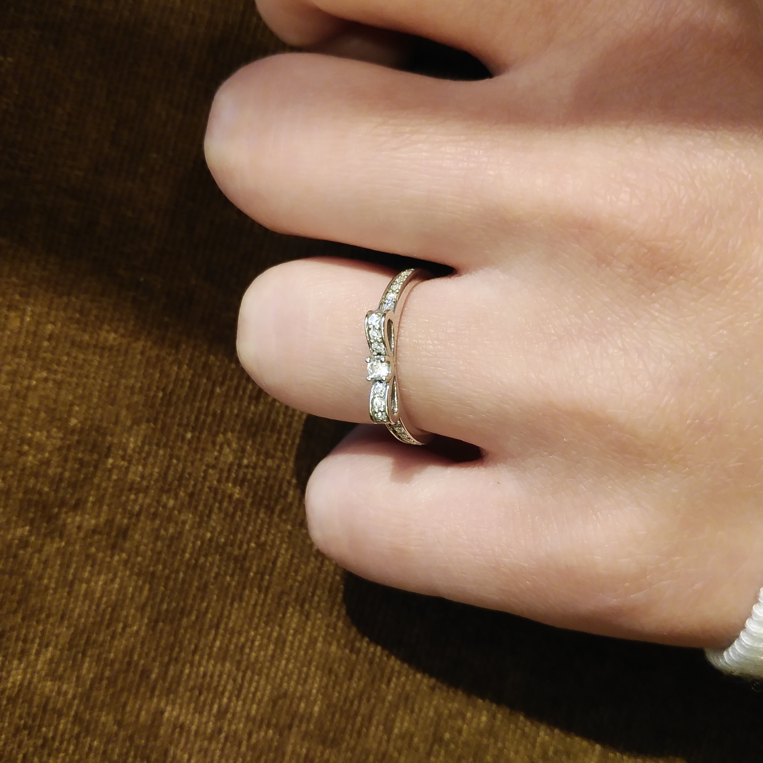 横から見ると立体感があり、真上から見るとエタニティーリングにも見えちゃうキュートで目を引くリボンのデザインです。