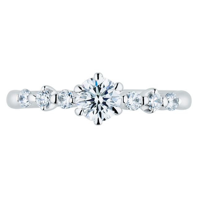 サイドのメレダイヤモンドを留める爪の位置を工夫することで、直線的なアームの中にリズミカルな躍動感が加わり可愛らしい婚約指輪「ブトン・ドール」。台座にさり気なくハートの窓が隠れていたりと、どの角度から見られてもキレイに、可愛く見える工夫が満載のデザインです。