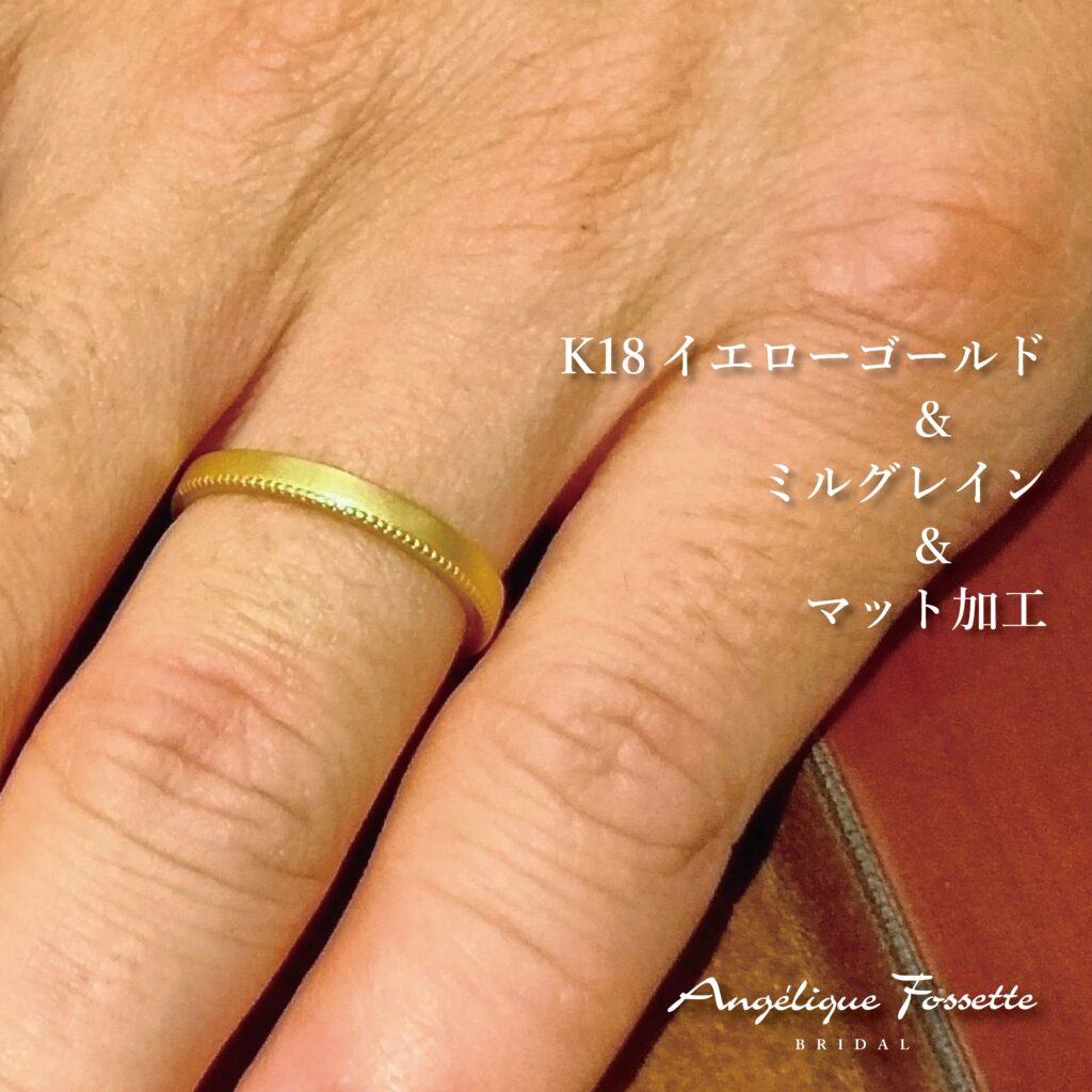 ふたりで過ごす穏やかな時の刻みをミル打ち加工で表現したオシャレな結婚指輪「アナエル」。リング素材はK18(18金)イエローゴールドで、全周つや消し加工をするセミオーダーをいただきました。