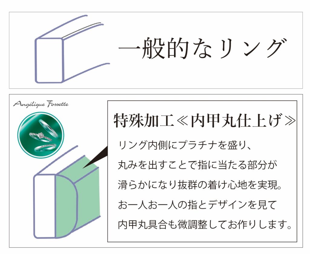 指輪の内側の角を磨いて丸く仕上げるのではなく、プラチナを上乗せして丸く仕上げているんです!この内甲丸加工は手作りでしか出来ない、特殊な加工となっております。この独自の加工を施すことによって驚くほど滑らかな着け心地になり、指輪によるストレスの無い快適な毎日を送っていただけます!指輪を着け慣れない男性様にも、内甲丸のついた結婚指輪は非常にオススメです!指輪のデザインももちろん大切ですが、長年着けるブライダルリングはこの目に見えない内側の加工が非常に重要になってくるのです。アンジェリックフォセッテはこの内甲丸加工を施して全ての指輪をひとつひとつ手作りしています。お客様の指のサイズに合わせて、0.1号単位で型から内甲丸をつけてお作りするので、アンジェリックの指輪は全て「オートクチュール」仕立てとなっております。