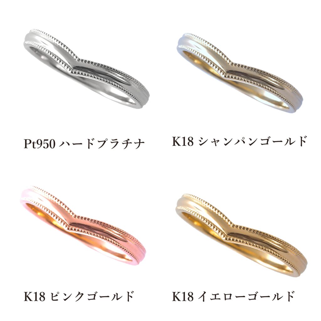 またK18(18金)とは75%以上が純金で、こちらも日常使いに耐えうる強度を保つために、割金として銀・銅等を25%混ぜ込んだものです。割金25%内の銀や銅の配合比率で、イエローゴールドやピンクゴールドなど様々なカラーバリエーションが生まれます。アンジェリックは「K18イエローゴールド」「K18ピンクゴールド」の品質でも指輪をお作りすることができ、お好みでご選択いただけます。