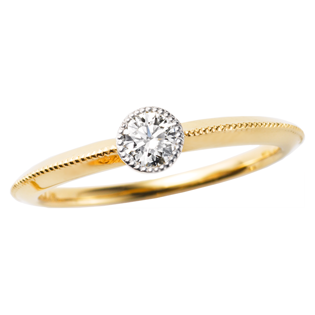 ダイヤモンドを留める台座はプラチナ、アームはイエローゴールドからなるコンビネーションエンゲージリング(婚約指輪)。アームのエッジ上とダイヤモンドを囲うようにミル打ちが施されたデザインで、よりダイヤモンドに目を行かせ、更にダイヤモンドを大きく見せる効果もある優秀デザイン!ダイヤモンドも爪留めでは無くフクリン留めで上面はフラットに留まり高さが出ないから、普段使いにもお洒落に着けこなせます。