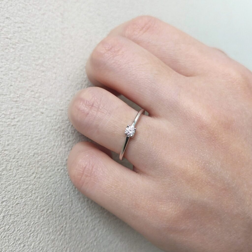 婚約指輪の定番「ソリテールリング(一粒石タイプ)」のデザイン。洗練されたシンプルなデザインは、平穏で、心安らぐ日々が続きますように…と願いが込められている。