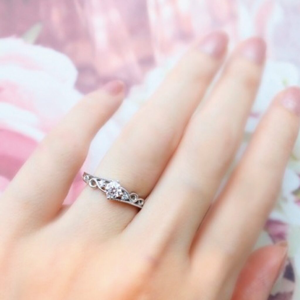 繊細な透かし模様とアームに施されたミル打ち加工がクラシカルな雰囲気を演出したエンゲージリング(婚約指輪)。アームや模様等、一つ一つの線が細身なので指に着けた時もボリュームが出過ぎることは無く、可憐でエレガントな印象に。細部までこだわったここにしか無いデザインは、オリジナルデザインで周りと差を付けたい方にもオススメ!