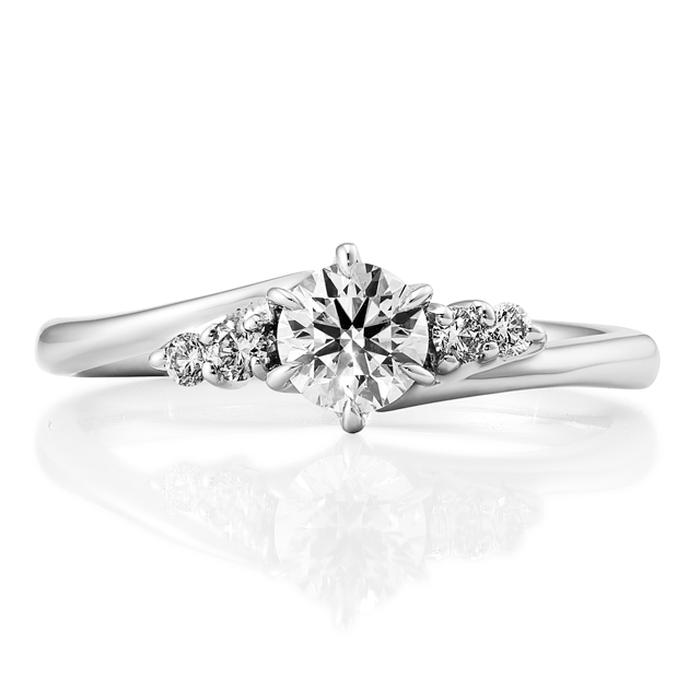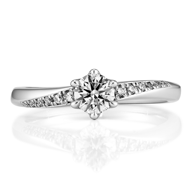 ストレートのアームに左右一つずつのメレダイヤモンドが留まる、王道人気エンゲージリング(婚約指輪)デザインのひとつ。メレダイヤモンドの存在感もプラスされた、シンプルかつ華やかな印象のデザインは、メインのダイヤモンドの大きさ問わずバランス良く着けこなせるのも魅力。