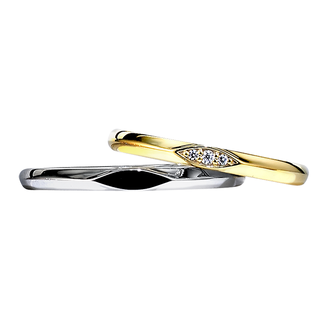 「ふたつとも、まったく同じデザインが良い」というご希望から、女性様の結婚指輪にはもともとダイヤモンドが3石セッティングされたデザインを石なしにするセミオーダーメイドを賜りました。