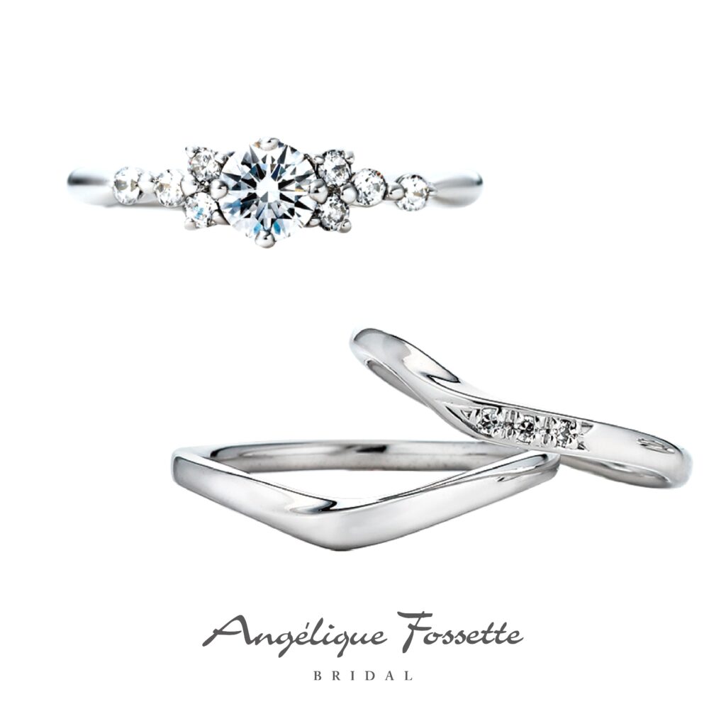 メインのダイヤモンドの脇にリボンの様に添えられたメレダイヤモンドの配置が可愛らしい華やか婚約指輪「カモミーユ」。あからさまな主張ではなくさり気なくリボンモチーフが隠れているので可愛すぎず、大人っぽさや豪華さも兼ね備えている点も人気のポイントです。