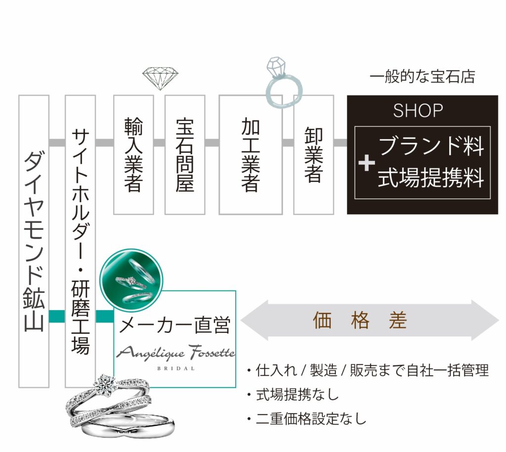 式場と提携することで、紹介料としてキックバックが発生します。そういった諸経費も加味してブライダルリングの定価が決められるので、アンジェリックでは式場との提携を行なっておりません。こういった事で、同じ品質の商品でも価格差が生まれます。