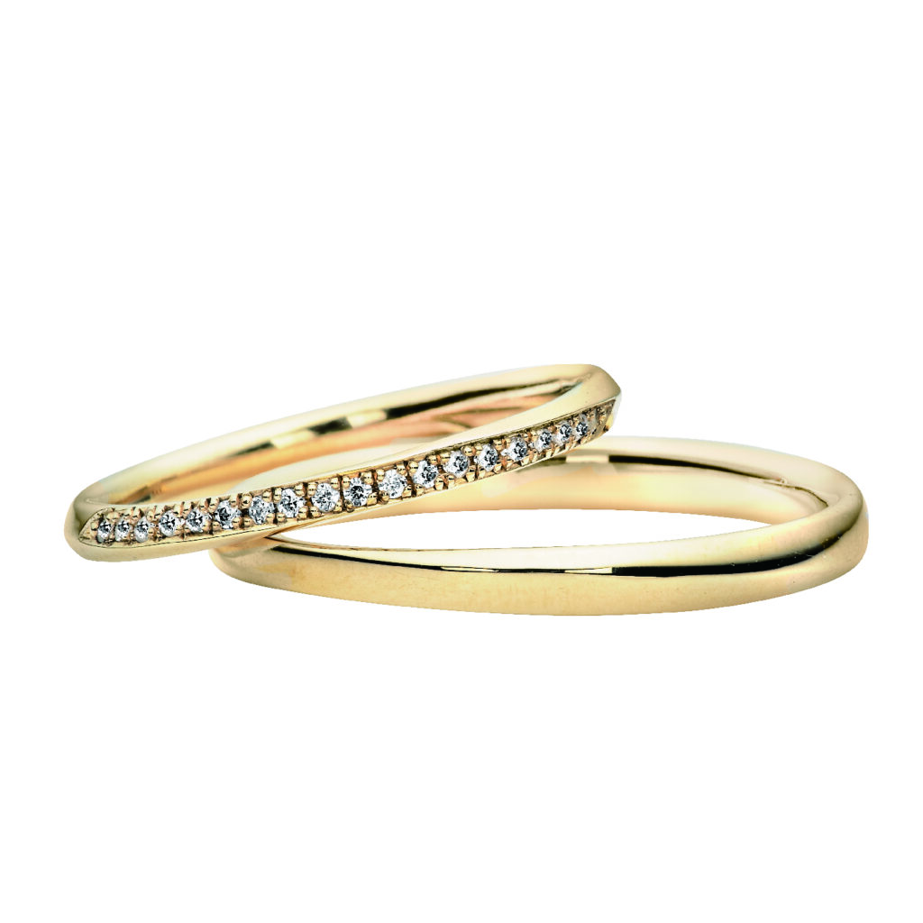 華やかなイエローゴールドでも、細身なので、自然に身に着けられる結婚指輪「サリエル」。