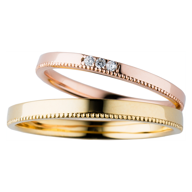 片側だけに施されたミル打ちで、シンプルと華やかさを併せ持つ結婚指輪「アナエル」は年代問わず人気!見る角度や、着ける向きによって様々な表情をみせてくれるので何年経っても飽きが来ないのも人気の秘訣。