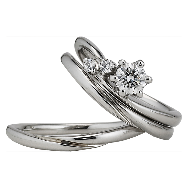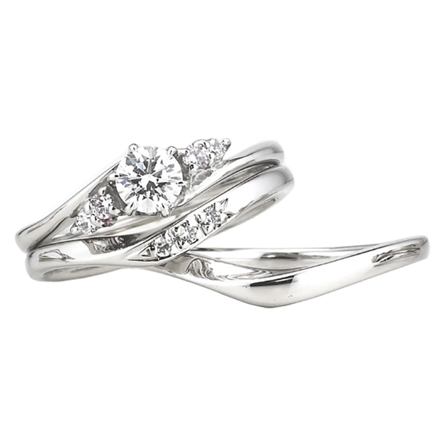 エンゲージリング(婚約指輪)は両サイドに2石ずつ施されたメレダイヤモンドの大きさが絶妙で、センターのダイヤモンドをとても美しく見せてくれるデザイン!手元をすっきり、きれいに見せてくれるV字アームのマリッジリング(結婚指輪)と重ねたときの一体感は秀逸。エンゲージリング(婚約指輪)単体でも、マリッジリング(結婚指輪)単体でも、そして重ね着けでも、三拍子揃って人気の高い優秀なセットリング!普段使いもお出かけにも、どんなシーンでも合わせられるデザインは男女ともにおすすめ。