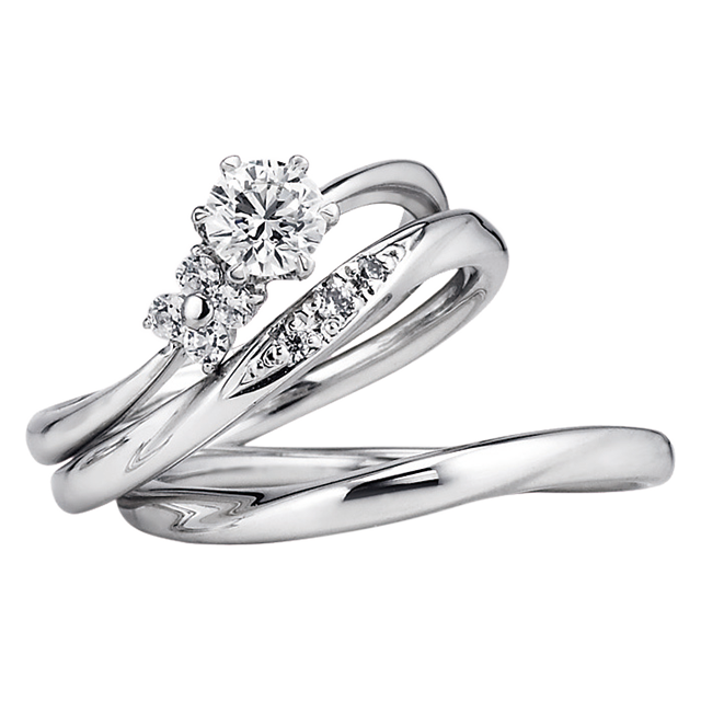 緩やかなカーブとメレダイヤモンドの配置は計算されつくした、存在感のあるエンゲージリング(婚約指輪)。リング全体が丸みを帯びたデザインで、女性の可憐さを引き立たせてくれる。まさに「大人可愛い」を実現できるリング。シンプルなマリッジリング(結婚指輪)と重ね着けすることで、エンゲージリング(婚約指輪)の繊細なラインをより際立たせダイヤモンドも映えるデザインに。定番タイプのマリッジリング(結婚指輪)は、シンプルゆえに着けるシーンや場所を選ばないと男性にも好評。