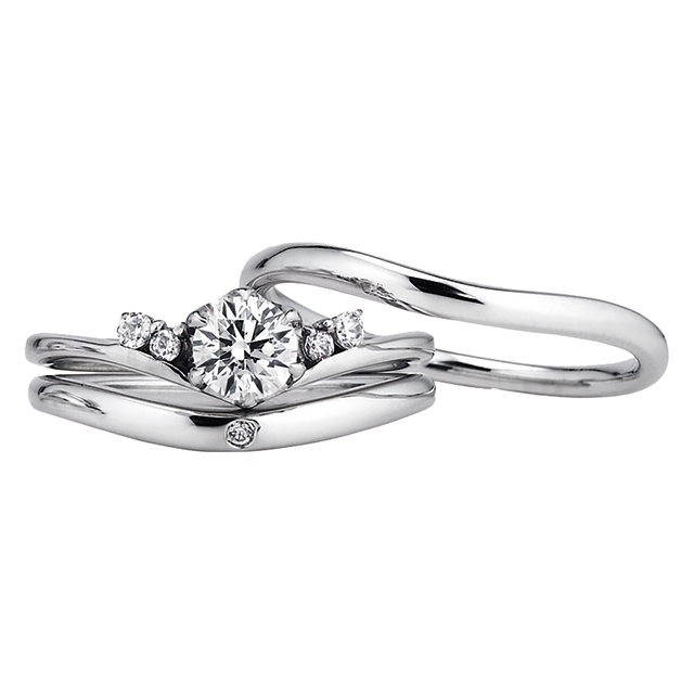ティアラモチーフのキュートなエンゲージリング(婚約指輪)と定番の王道シンプルマリッジリング(結婚指輪)のセットリング。センターのダイヤモンドが存分に目立つようメレダイヤモンドの位置が細かく計算された華やかなデザインと、シンプルな中にも素材の良さが存分に引き立つ印象のデザインは、普段はシンプルに、ここぞ!というときには重ねて華やかな印象にしたいという方におすすめの組み合わせ!細身で違和感なく着けられるので、男性からも人気。