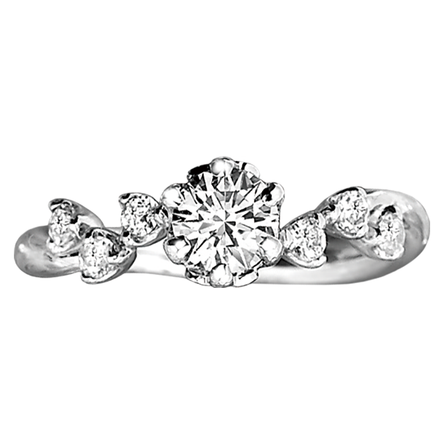 ランダムに配置されたメレダイヤモンドがリズミカルで軽やかな印象を与えるキュートなエンゲージリング(婚約指輪)。指の上で踊るダイヤモンドが印象的なデザインは、華やかでありながらしっかりとメインのダイヤモンドも目立たせてくれます。
