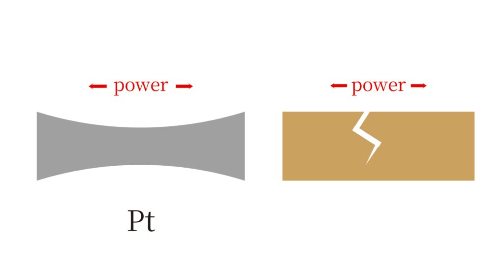 またプラチナの粘りは、叩きすぎたり曲げたりしても割れにくいという性質を持っています。