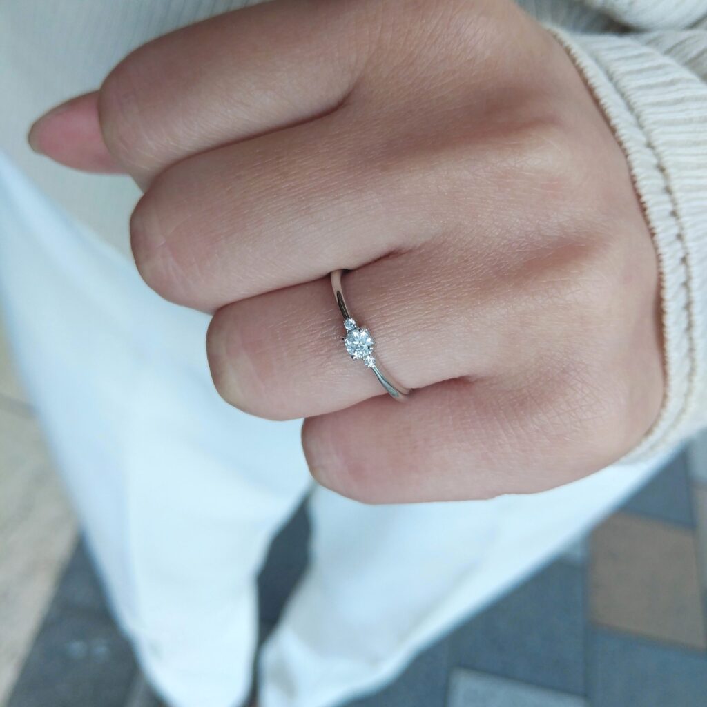 真ん中のダイヤモンドは普段使いしやすく毎日寄り添ってくれるサイズ感です。