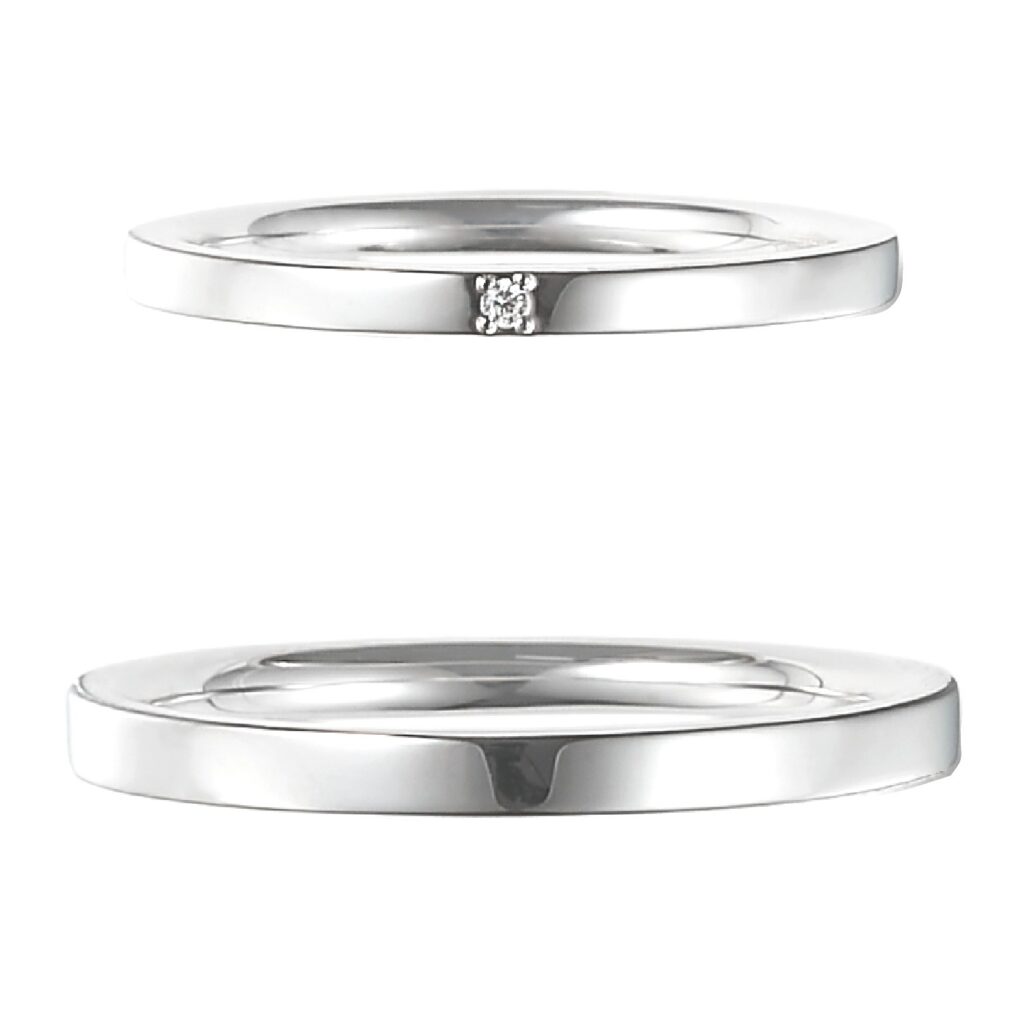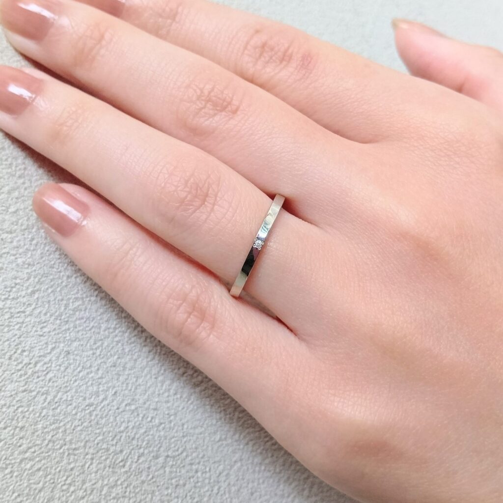 一周デザインが変わらない、ストレートのとてもシンプルなマリッジリング(結婚指輪)。平打ちベースにすることでお互いへの真っ直ぐで固い信頼の強さを表現している。絶妙な幅と厚みに設計しているので平打ちでも存在感が出すぎず、指あたりも優しい着け心地なのも嬉しいポイント。