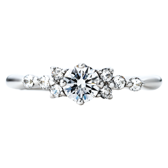 メインのダイヤモンドの脇にリボンの様に添えられたメレダイヤモンドの配置が可愛らしい華やかエンゲージリング(婚約指輪)。あからさまな主張ではなくさり気なくリボンモチーフが隠れているので可愛すぎず、大人っぽさや豪華さも兼ね備えている点も多くの花嫁から支持されています。