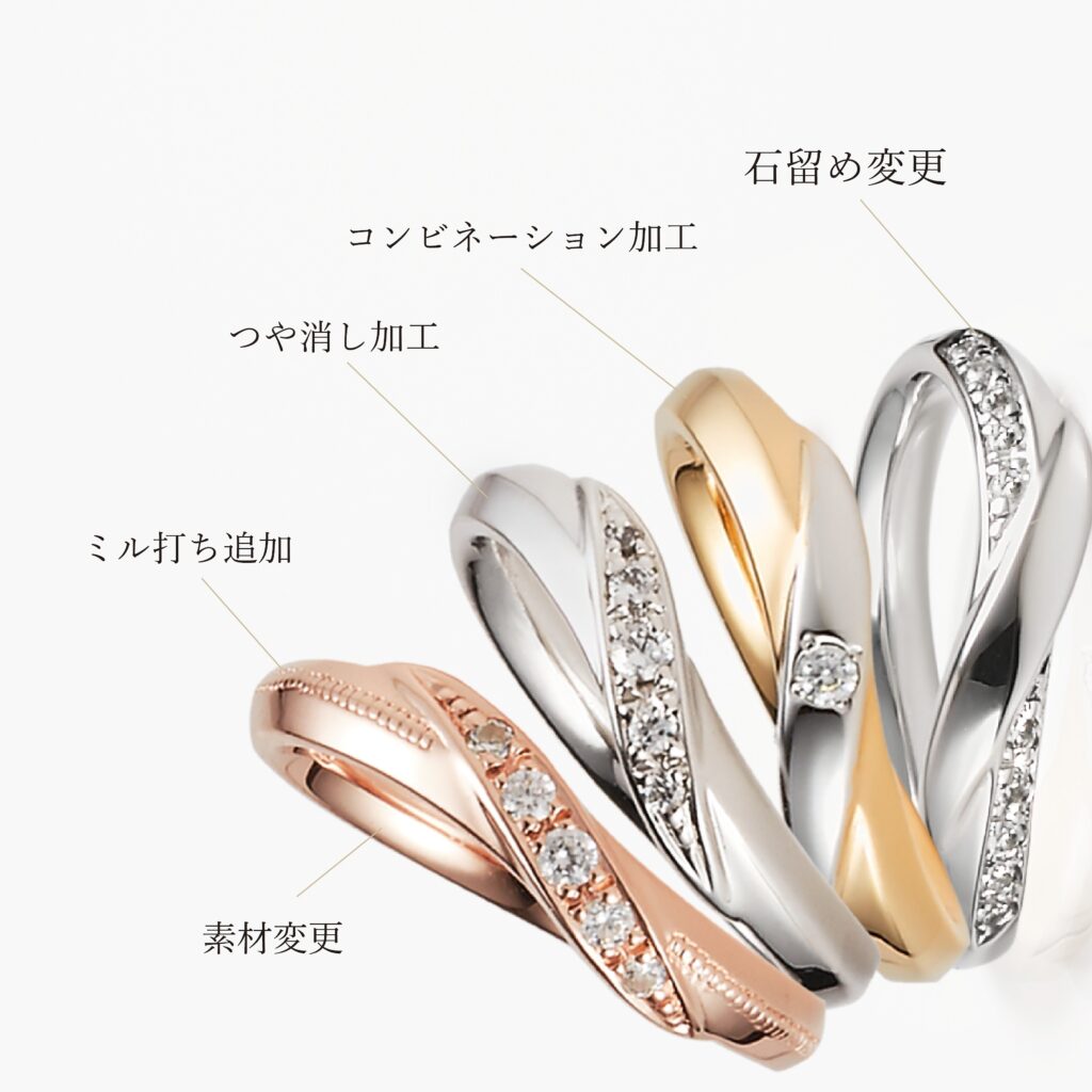 ゴールドへの素材変更や、一部分だけ素材を変更するコンビネーション加工、つや消し、ミル打ち加工の追加など、多彩なアレンジが可能です。