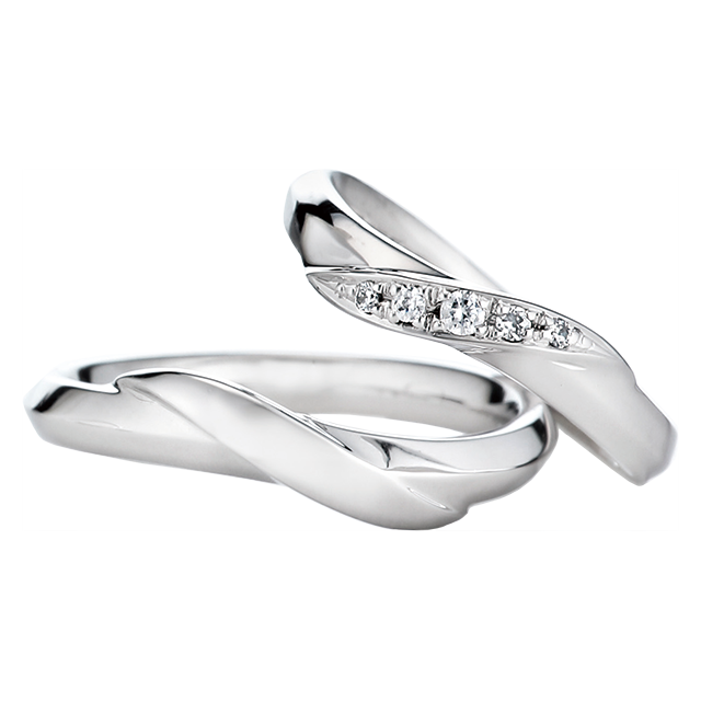 ほど良いボリューム感と溢れるように配置されたダイヤモンドが美しい人気の結婚指輪「トワ・エ・モア」。女性と男性でウェーブのラインが逆転しているので、ふたつのリングを合わせるとハートが浮かび上がります。さり気ない仕掛けが大人可愛いデザインです。