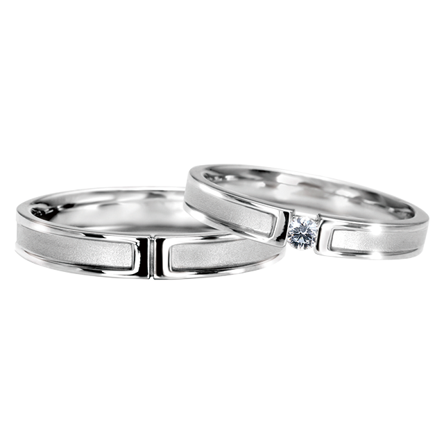 女性用はつやを消したクールな印象のデザインに、大粒の一粒ダイヤモンドをセッティング。男性用はつや消しとつや有り部分のコントラストがお洒落なマリッジリング(結婚指輪)。オン・オフ共に様々なシーンで魅力的な手元を演出します。幅のあるスタイリッシュなデザインですが、内側に着けた丸みなど、着け心地にも拘ったデザインなので、ぜひお試しを!つや消しのアレンジは自由なので、鏡面仕上げにすればまた違った雰囲気を楽しめます。