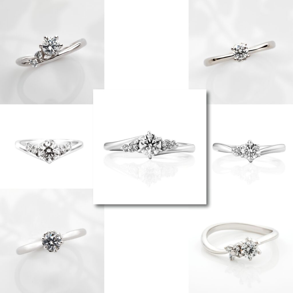婚約指輪(エンゲージリング)7型のラインナップは、シンプルで王道のソリテールリング2型、サイドメレが華やかなもの・アシンメトリーなデザインがオシャレなものが5型と、幅広いバリエーションをご用意しました。この中からお好きな婚約指輪をお選びいただけます!