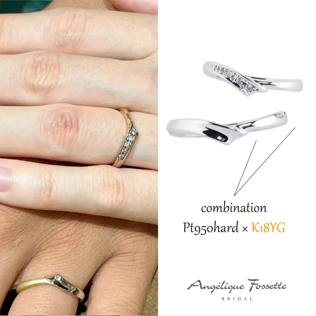 リングのお好きな部分をお好きな素材へ変更するコンビネーション加工のセミオーダーをされたお客様の結婚指輪です。こちらのオーダーは、プラチナ多めでフォーマル感をしっかりと、イエローゴールドはアクセントで少し取り入れるようなコンビネーションアレンジをなさいました。色味やその割合によって指輪の印象はガラリと変わります。プラチナやイエローゴールド以外にも、ピンクゴールドなどさまざまなカラーゴールドの中から素材をお選びいただけます。