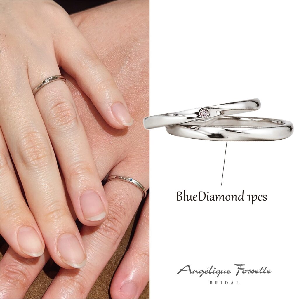 石無しのデザインへ、お好みの宝石を追加で留めるセミオーダーをされたお客様の結婚指輪です。こちらのお客様は、男性様のリングへブルーダイヤモンドを1石追加でセッティングするセミオーダーを賜りました。男性側にも宝石が留まっている結婚指輪ってあまりなく、とても珍しいので、人と被りにくいのも嬉しいポイントですよね。アンジェリックフォセッテでは、すべての結婚指輪へ追加でお好きな宝石をお留めすることができます。加工賃は弊社持ちで、石代のみでダイヤモンドなら1石税込6,000円、ルビーやサファイアなどの誕生石なら1石税込3,500円からのご案内です。