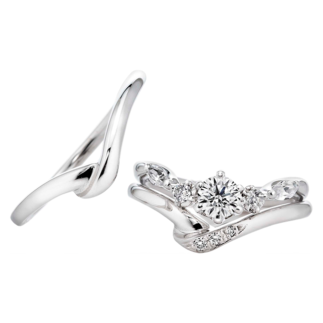 V字ラインに沿ってマーキースダイヤモンドがあしらわれた個性派エンゲージリング(婚約指輪)。大胆な動きのラインはメインのダイヤモンドをより際立たせてくれる。デザイン性は高いが、エンゲージリング(婚約指輪)を選ぶポイントである『真ん中のダイヤモンドがしっかり目立つ』、『普段使いしやすい』という王道な部分も押さえた優秀デザイン。同じくV字ラインを強調したマリッジリング(結婚指輪)と重ねると、より指が長くきれいに見え重ね着けをした際の統一感もバッチリと女性に人気のセットリング!