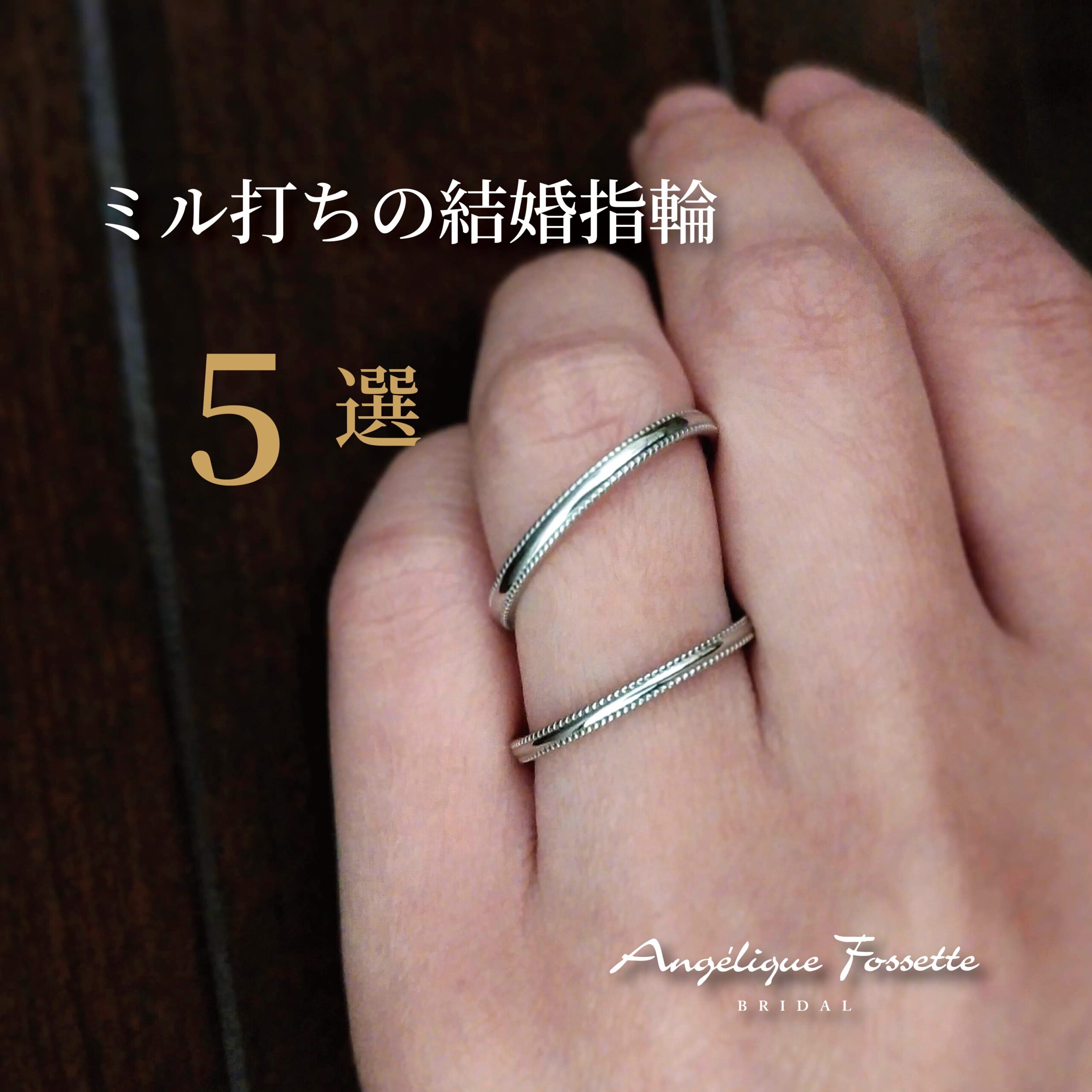 技法にとことんこだわり細部までミル打ちがあしらわれた、繊細で上品な雰囲気がとっても素敵なマリッジリング(結婚指輪)。ストレートのシンプルな形の中にも大人な雰囲気があり、細身なデザインなので着け心地も抜群。女性はもちろん男性でも着けやすいデザイン。女性のメレダイヤモンドをぐるりと囲んだミル打ちがとってもキュートで煌びやか♪アンティークでクラシカルな雰囲気がありつつも上品で可愛らしい手元を演出できること間違いなし!