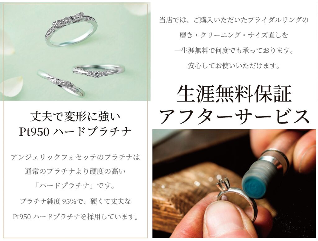 アンジェリックフォセッテがお仕立てしている指輪は全て高品質なPt950ハードプラチナを使用してオートクチュールでおつくりしている事、1本1本着け心地にこだわった加工を施している事、手厚いアフターサービスをご用意している事などから、多くのカップル様にご支持いただいております。