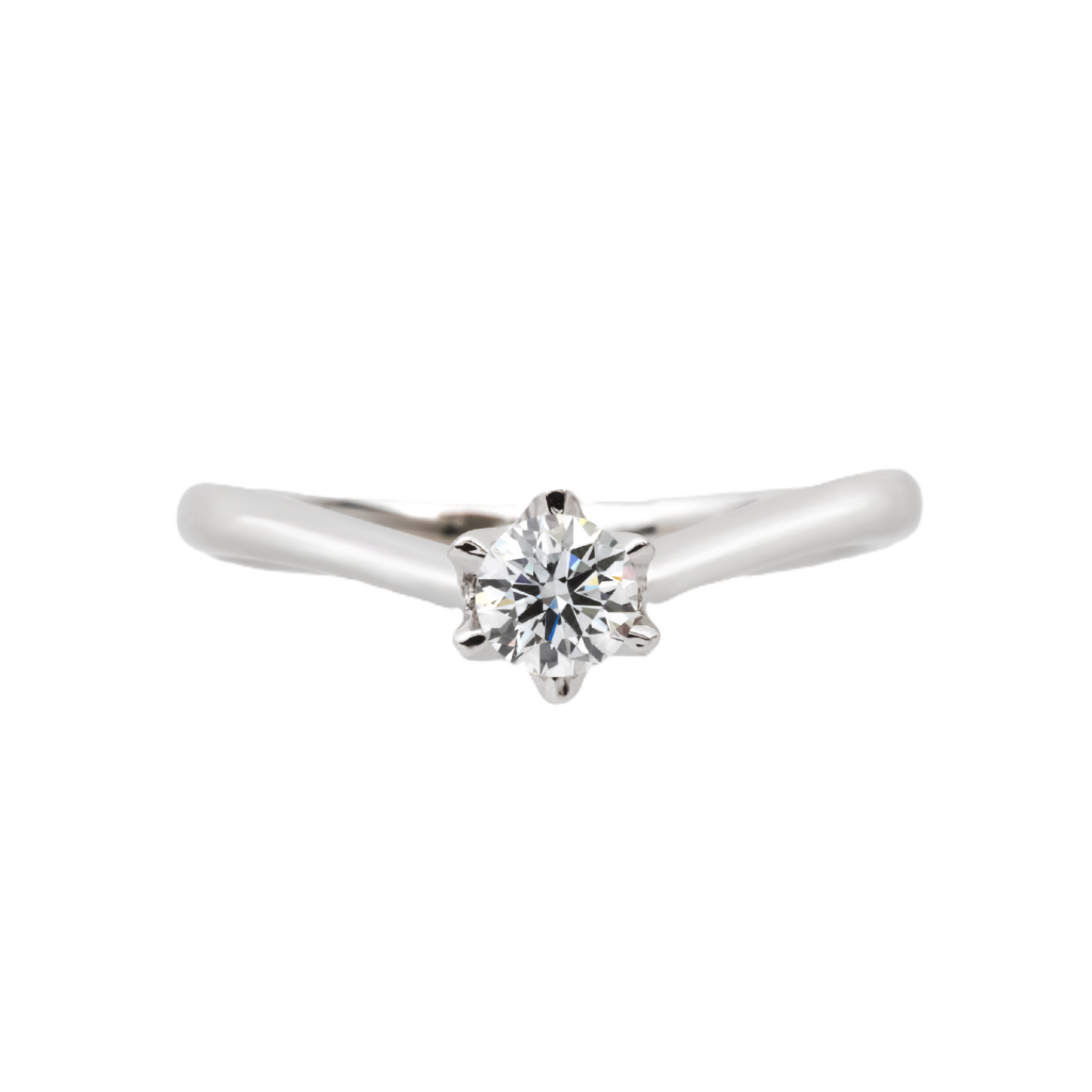 メインのダイヤモンドが星のようなシルエットに見えるのは5本爪セッティングの効果。安定感のあるボリュームのアームと、極力高さが出ないようにダイヤモンドは腰を低く留めるデザインで、普段使いをしたい女性へおススメの人気の婚約指輪「アンコリ」。