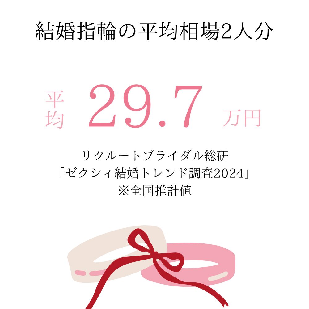 大手結婚情報誌ゼクシィのトレンド調査によると、結婚指輪の平均相場(ペア)は2024年の時点で約30万円です。また近年の地金高騰による影響で、平均相場は年々上がってきているといわれております。