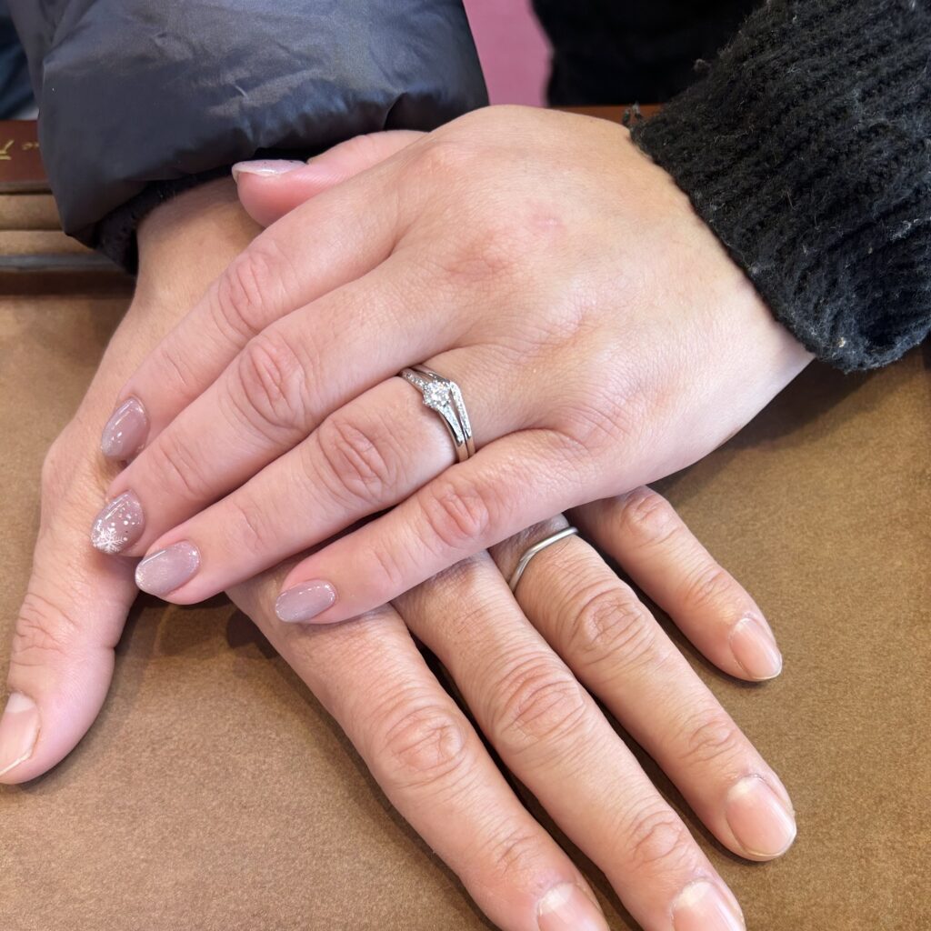結婚指輪は細身のV字デザイン。男性様リングにはマット加工アレンジでオシャレに!