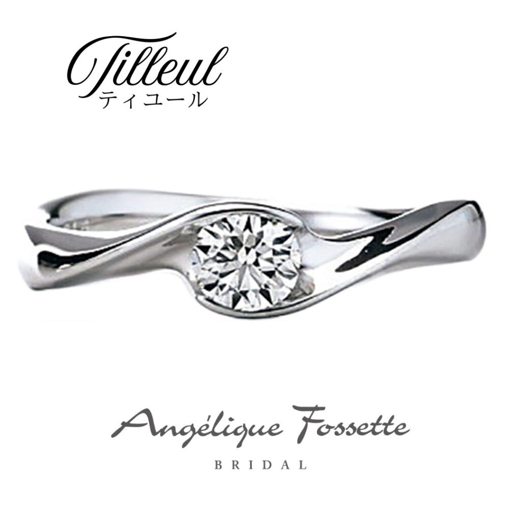 計算されたアームのひねりによって光が当たった際にアームに白く光る部分と黒く影になる部分が現れ、よりダイヤモンドの輝きを際立たせ美しく見せる大人っぽい印象のエンゲージリング(婚約指輪)。埋め込みタイプのデザインは幅の太いデザインが多くなりがちでも、エッジを効かせ更に大胆にひねりを入れたデザインは逆に手元をすっきりと演出、スタイリッシュで洗練されたデザイン性の高さと引っかかりがなく強度もある実用性も兼ね備えた人気デザイン。
