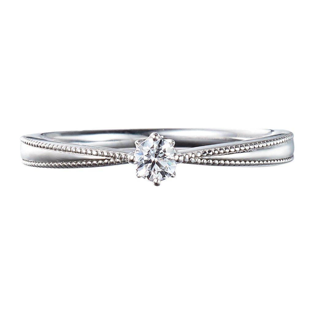 アーム部分に施されたミルグレイン(ミル打ち)。この加工と、メインのダイヤモンドに向かってアームを細く絞ることの効果で、ダイヤモンドをより際立たせている。ミル打ちには、「千の粒」という意味があり、“永遠”や“長寿”など、とても縁起の良い意味を持つため、プロポーズで贈られる婚約指輪(エンゲージリング)としてもおすすめ。ふたりの進む道を、いつも明るく照らしてくれますように…。