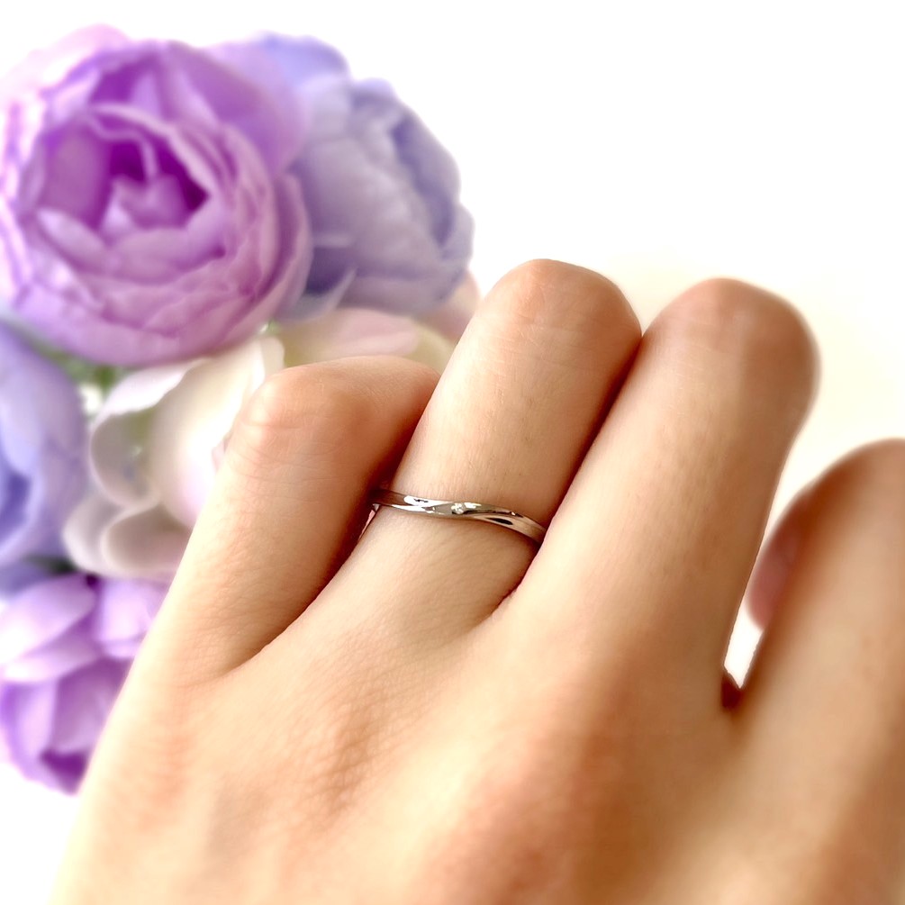 繊細ながら力強いウェーブが特徴のシンプルなマリッジリング(結婚指輪)。湖を優雅に泳ぐ白鳥、そして湖面に反射した光のようにおふたりの未来もいつまでも穏やかで、そして輝かしいものでありますように、と願いも込められている。