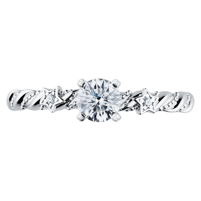 ミル打ち加工と無垢のプラチナが蔦のように交互に絡まり合う繊細なアームのデザインがお洒落なエンゲージリング(婚約指輪)。左右のアームに配された星モチーフを、星の軌跡を表現したアームのデザインがより際立たせ、とてもデザイン性の高いリングに。メインのダイヤモンドはあえて4本爪にすることでアームのデザイン性を活かしながらもスッキリとまとまりのある印象を作っている。カジュアルな場面で沢山着けたい女性へもオススメのデザイン!