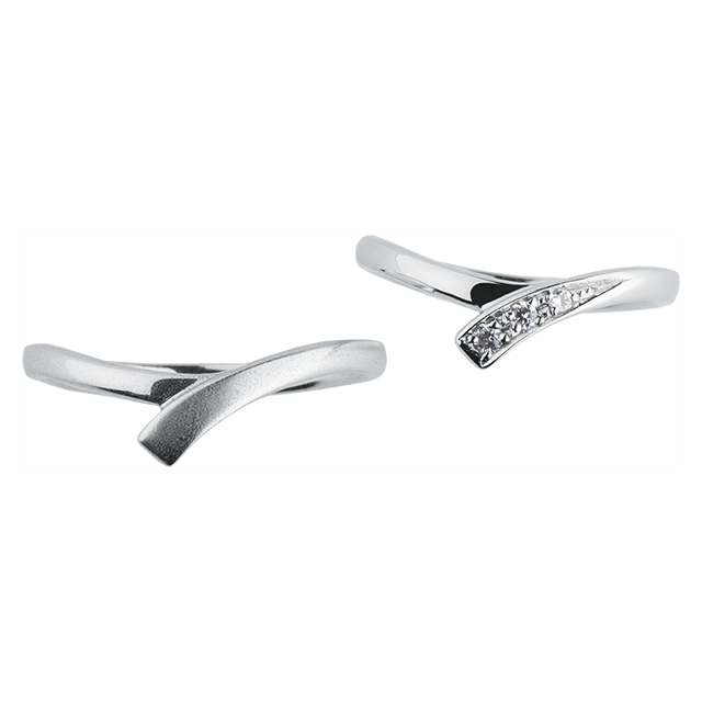 人の絆をリボンに見立て、永遠にほどけないようにと願いを込めたマリッジリング(結婚指輪)。メレダイヤモンドや、つや消しがアクセントに。周りに差をつけるデザインをお探しの方にオススメ!ベースはVラインになっており、リボンを表した下に伸びるデザインが指先をすっきりとした印象に見せてくれる。女性用にはメレダイヤモンドで華やかさと可愛らしさをプラス!男性用にはつや消し加工を施し、リボンでも甘くなり過ぎずスタイリッシュに着けられる。