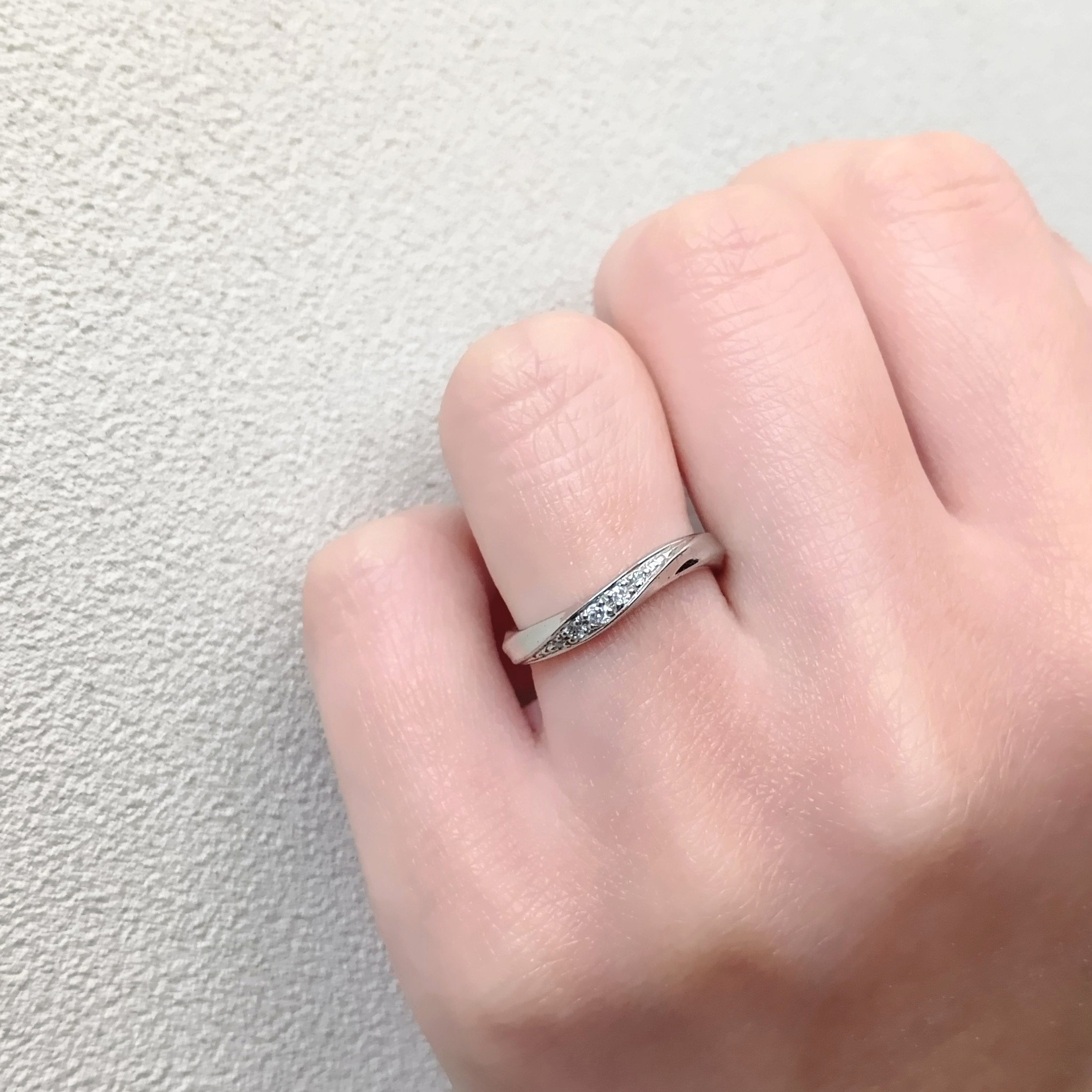 愛する幸せを教えてくれたあなたへ。エッジの効いたウェーブのラインで、おふたりの愛の強さを表現したマリッジリング(結婚指輪)。ひねりの効いたデザインが、力強い印象を与えますが、ウェーブラインは指馴染みがとても良く、着け心地も抜群です。女性のリングにグラデーションで留めたダイヤモンドが、何十年先も手元を輝かせてくれます。プラチナを贅沢に使用したほどよいボリューム感は、男性の手元にも馴染みやすく、どんなシーンでもお使い頂けます。