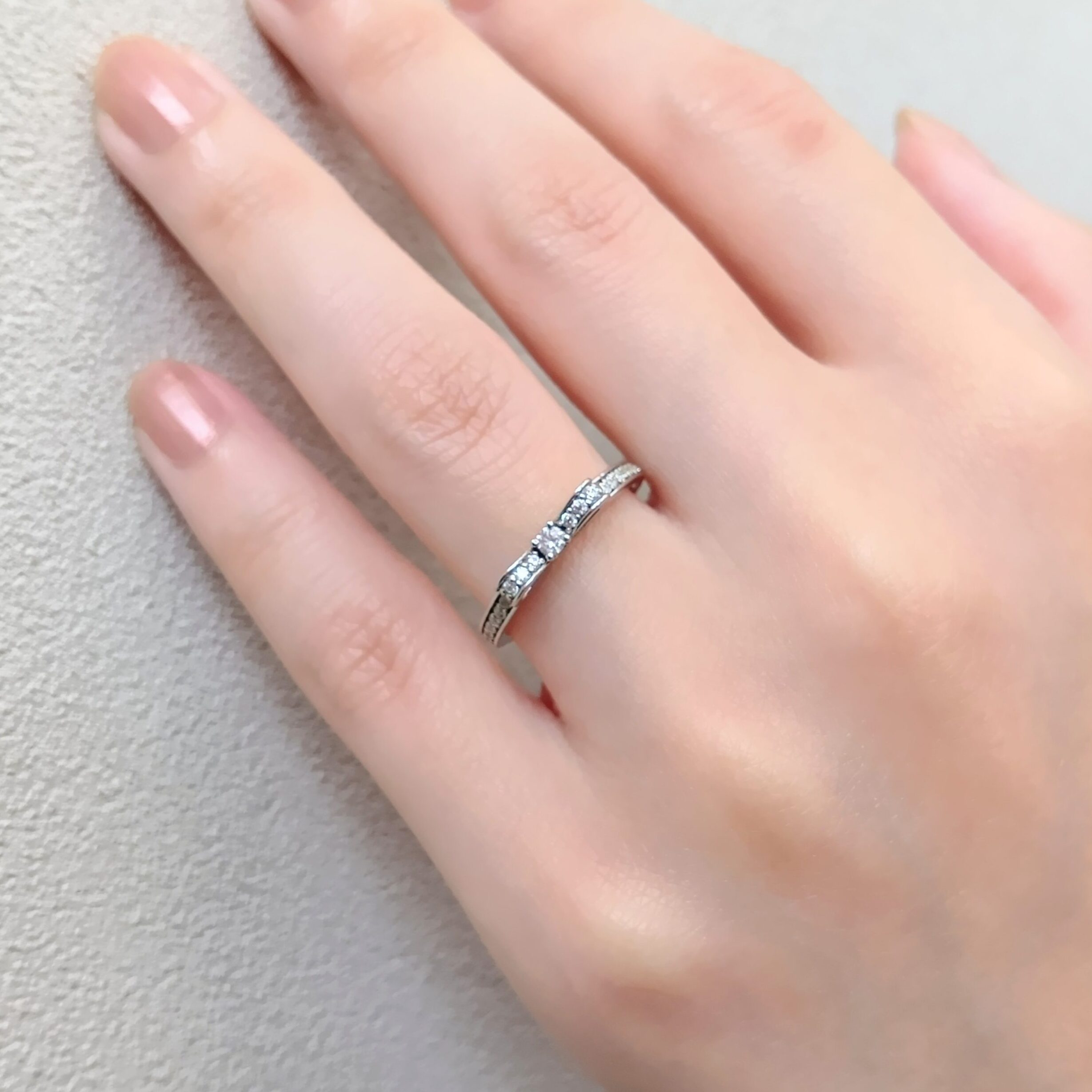 キュートで目を引くリボンのデザイン。横から見ると立体感があり、真上から見るとエタニティリングにも見えちゃう♪リボンモチーフのリングには【結びつける】という意味があり、人との結びつきをより強くしてくれるとされている。恋人から贈られると2人の関係がより深まる素敵な指輪!シンプルかつ可愛らしいデザインでもさりげなくリボンもポイントで手元から女性らしさを演出してくれるデザイン。エンゲージリング(婚約指輪)にもマリッジリング(結婚指輪)にも使える優れもの♪