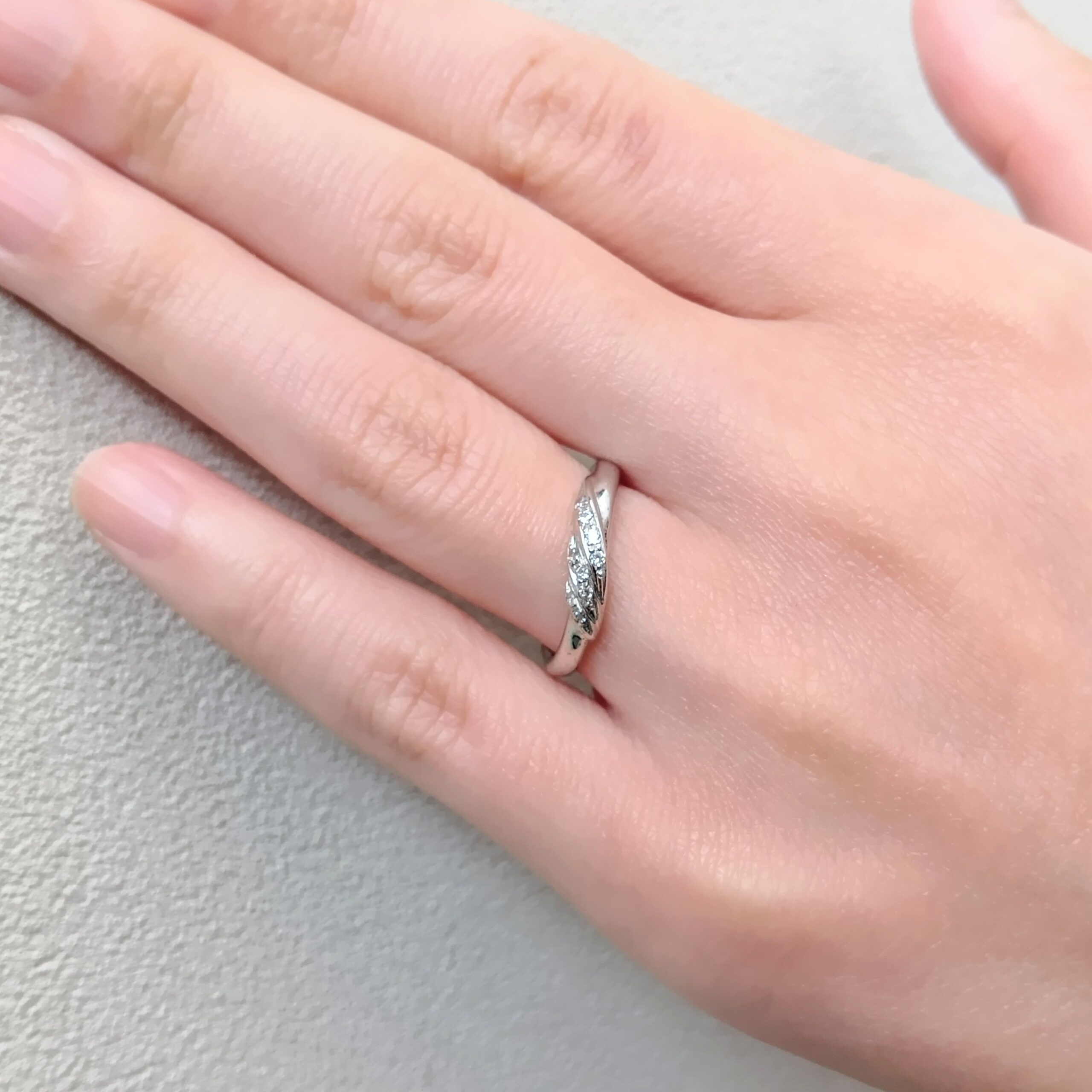 おふたりの幸せな毎日をそっと笑顔で見守る天使。ふたつのリングを重ねると、より一層羽のラインが綺麗に浮かび上がり、まるで天使がはばたいているように見えます。緩やかなS字のウェーブは、指馴染みが良く、羽のラインは指を細く長く見せる効果も。女性用にはダイヤモンドをセッティングして華やかに。男性用は羽の部分にマットなつや消し加工を施すアレンジも人気です。他では見られない、一目置かれるお洒落なオリジナルマリッジリング(結婚指輪)です。