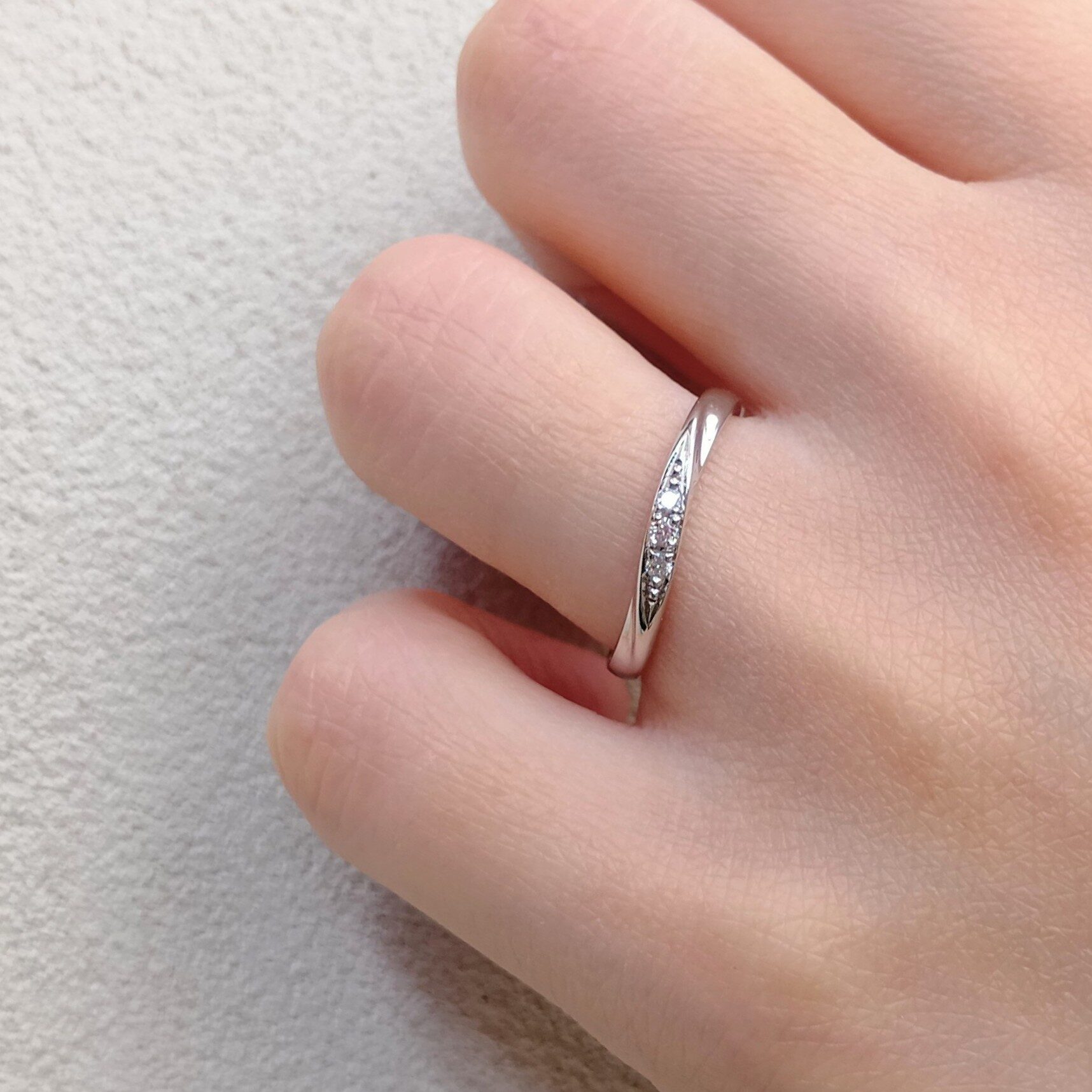 丸みのある曲線で柔らかな雰囲気のあるデザイン。ふたりを包み込む穏やかな時の流れを表現するようなS字ラインのマリッジリング(結婚指輪)。さらに手元の水かきに添って流れるように計算され作られているラインは手元を綺麗に見せてくれる。女性のマリッジリング(結婚指輪)にはダイヤモンドを3石あしらい、シンプルの中にも程よい華やかさをプラスして可憐にきらめきを与えてくれる。派手すぎないデザインは年齢を重ねても長年愛用出来るデザイン。さらに細身なので着け心地も抜群で普段リングを着け慣れていない男性にもおすすめ♪