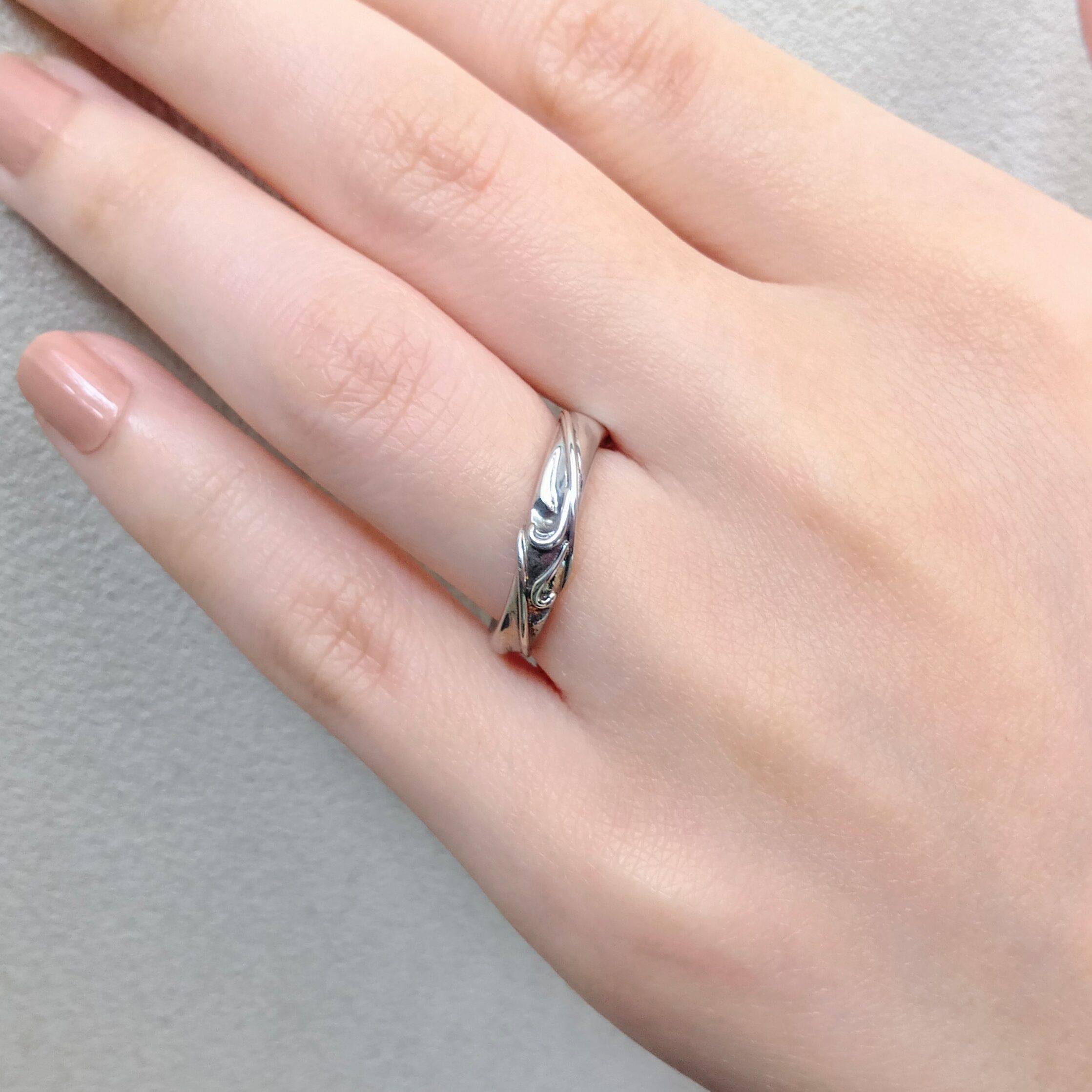 ふたりの幸せを願う空と天使の羽をイメージしたデザイン。羽を浮き彫り加工で表現した立体感のあるマリッジリング(結婚指輪)です。ふたりの幸せに向かって羽ばたいてほしいという願いが込められています。浮き彫り加工は、見る角度によって様々な表情が楽しめます。シンプルなリングでは物足りない、お洒落でオリジナリティのあるマリッジリング(結婚指輪)をお探しのカップルにオススメです。ボリューム感のあるデザインなので、緩やかなウェーブを付けて、着け心地にもこだわりました。普段使いにもオススメです。