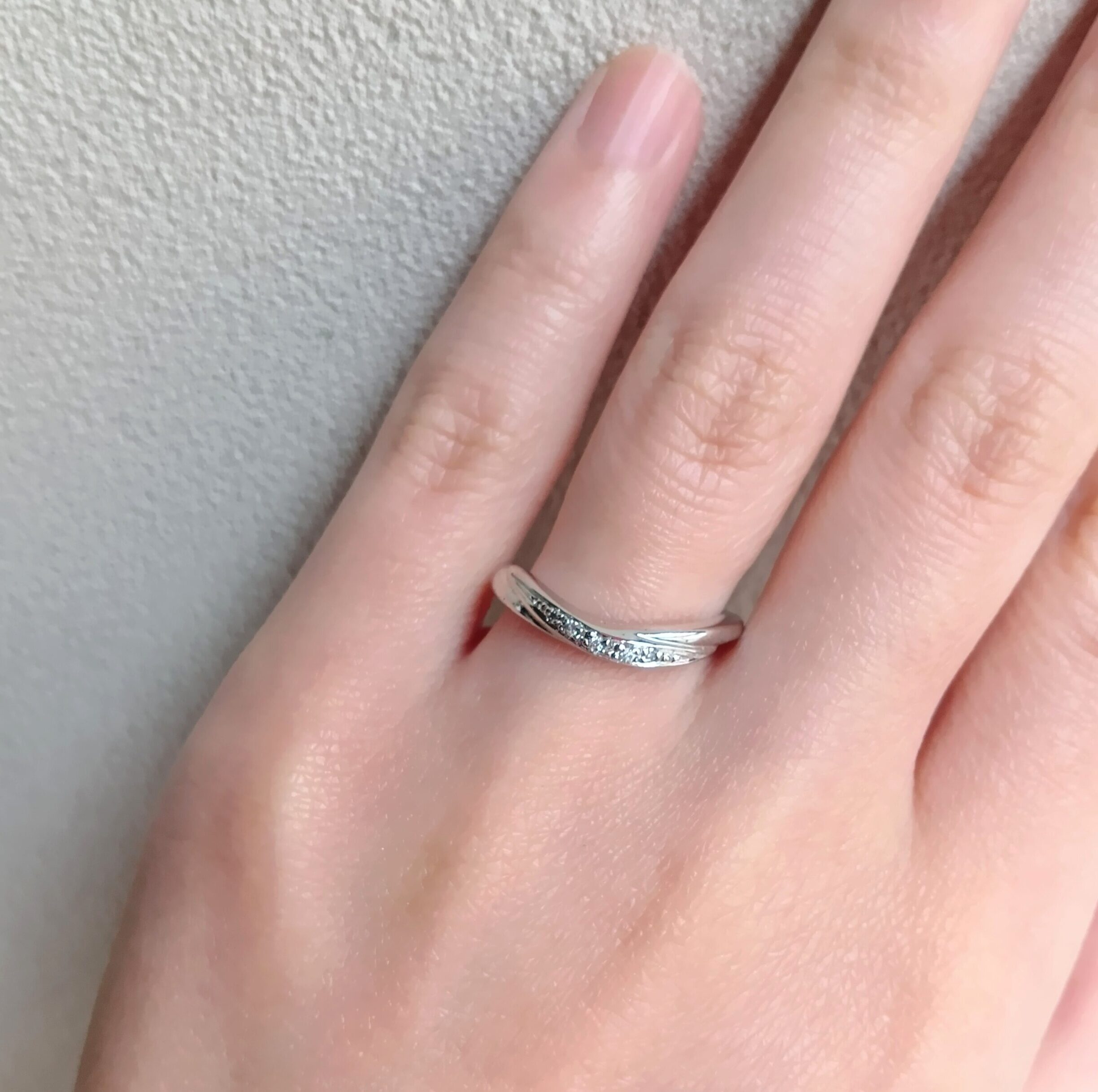 優しいあなたへ、優しい愛を。やわらかなラインで描いたカーブが大きな愛情を表現したマリッジリング(結婚指輪)。プラチナの重厚感が落ち着いた雰囲気を演出。緩やかなV字のラインが手元を優しい雰囲気にしてくれ、グラデーションで留めたダイヤモンドがより一層女性の魅力を引き立てます。男性用は一部分にマットなつや消し加工を施すことでシンプルながらもお洒落な印象に。飽きがこないデザインはいつまでもふたりの愛を伝え続けてくれるはずです。