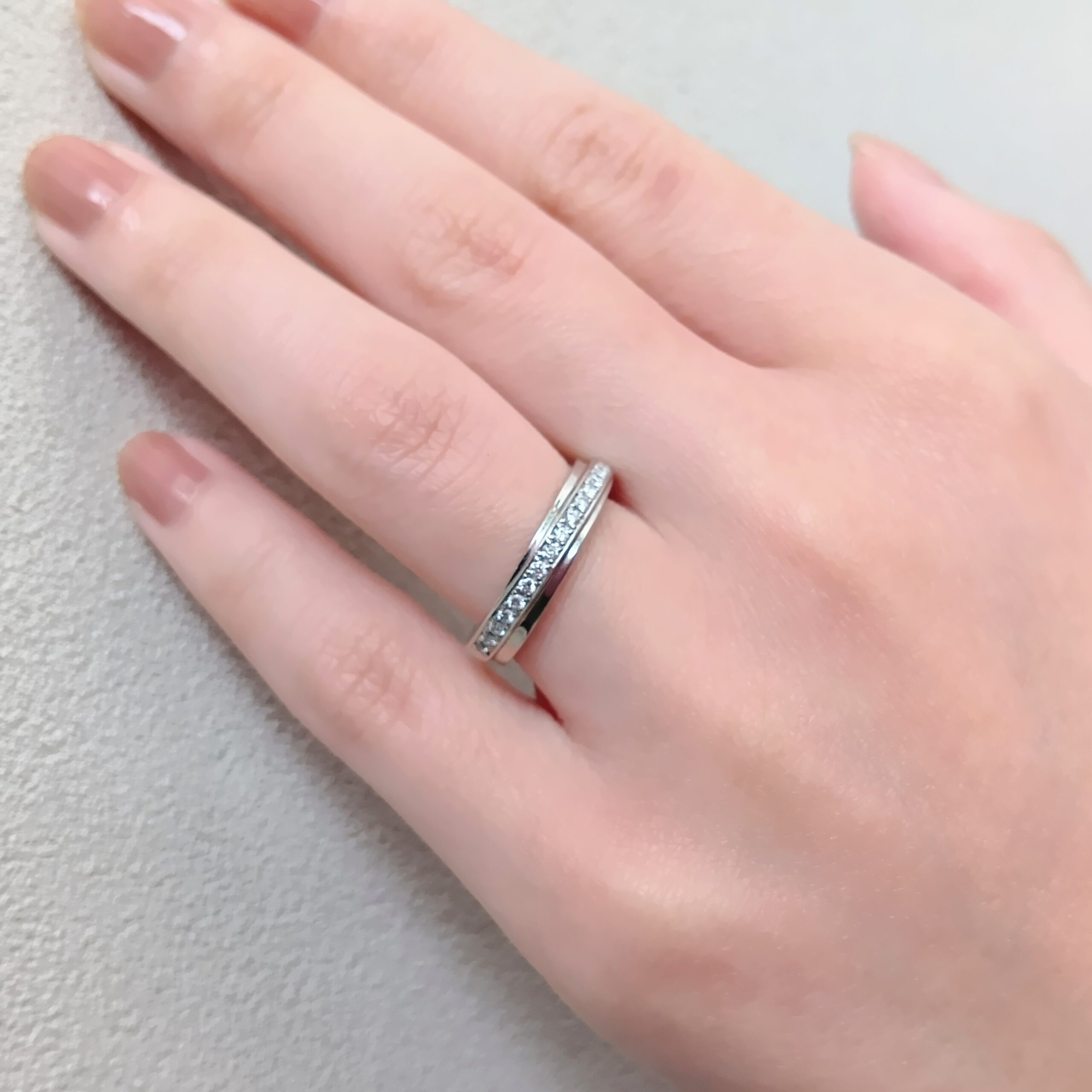 『一生一緒にいようね』この瞬間、最高の幸せを表現したマリッジリング(結婚指輪)。女性用はボリューム感のあるリングにダイヤモンドを斜めにあしらったエレガントなデザイン。男性用はシンプルながらもプラチナの重厚感が感じられる大人っぽいデザイン。手元を見る度に幸せの存在感を感じられます。ダイヤモンドは多めにセッティングされていますが、斜めのラインでさりげなく。つや消し加工も格好良い仕上がりになります。着け心地にもこだわったマリッジリング(結婚指輪)です。