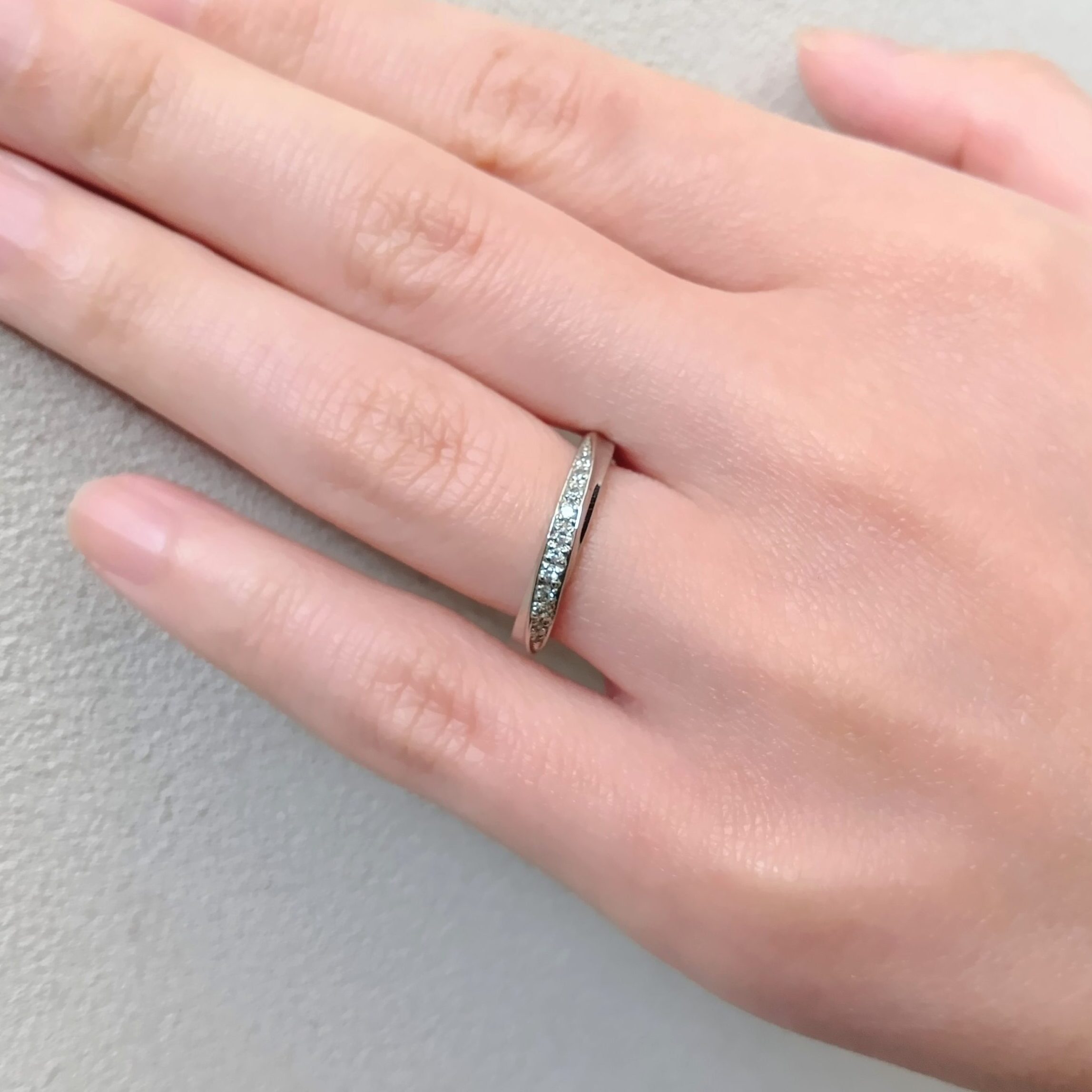 リング幅が細過ぎず、太過ぎず、ちょうど良いボリュームで、年齢問わず長年愛用出来ると好評のマリッジリング(結婚指輪)。シンプルなストレートラインにポイントでエッジが効いたデザインは、男性支持も高い。女性にはダイヤモンドがふんだんにあしらわれ、華やかで満足度の高いデザイン。ストレートながらも斜めに留められたダイヤモンドが手元を綺麗に魅せてくれる、こだわりのマリッジリング(結婚指輪)。