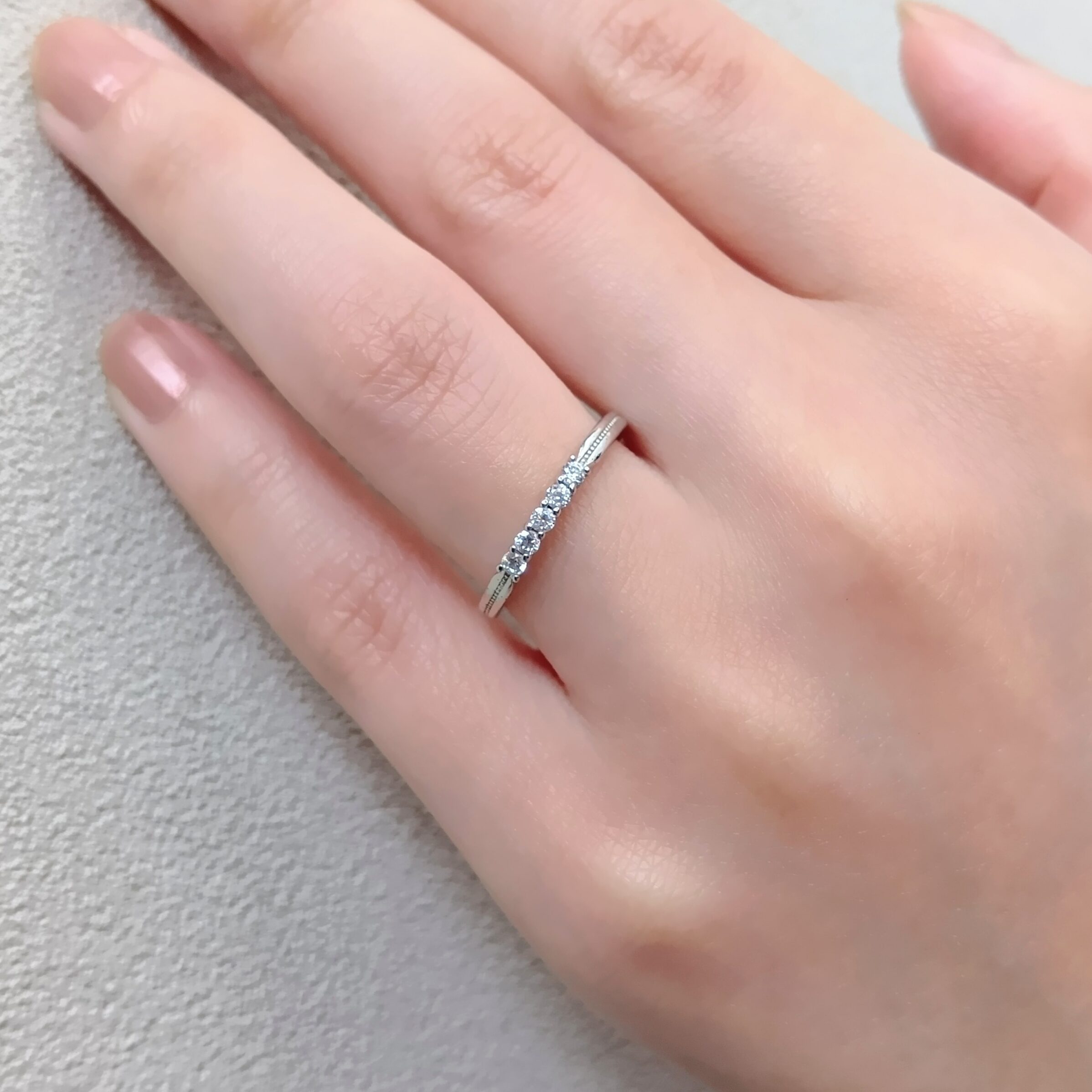 一つ一つのダイヤモンドが目立つように作られたデザインは、シンプルな中に存在感もある大人の上品なマリッジリング(結婚指輪)。華やかさもありながら、洗練された大人っぽいデザインに。さらにミル打ち加工を入れることにより、全体がぐっと引き締まった印象に変わり、表面に光が反射する事で上品な素材の輝きをプラスしてくれる。さりげなくデザイン性があるリングなのでカジュアルなシーンやフォーマルなシーンでも両方使いやすいのも魅力。
